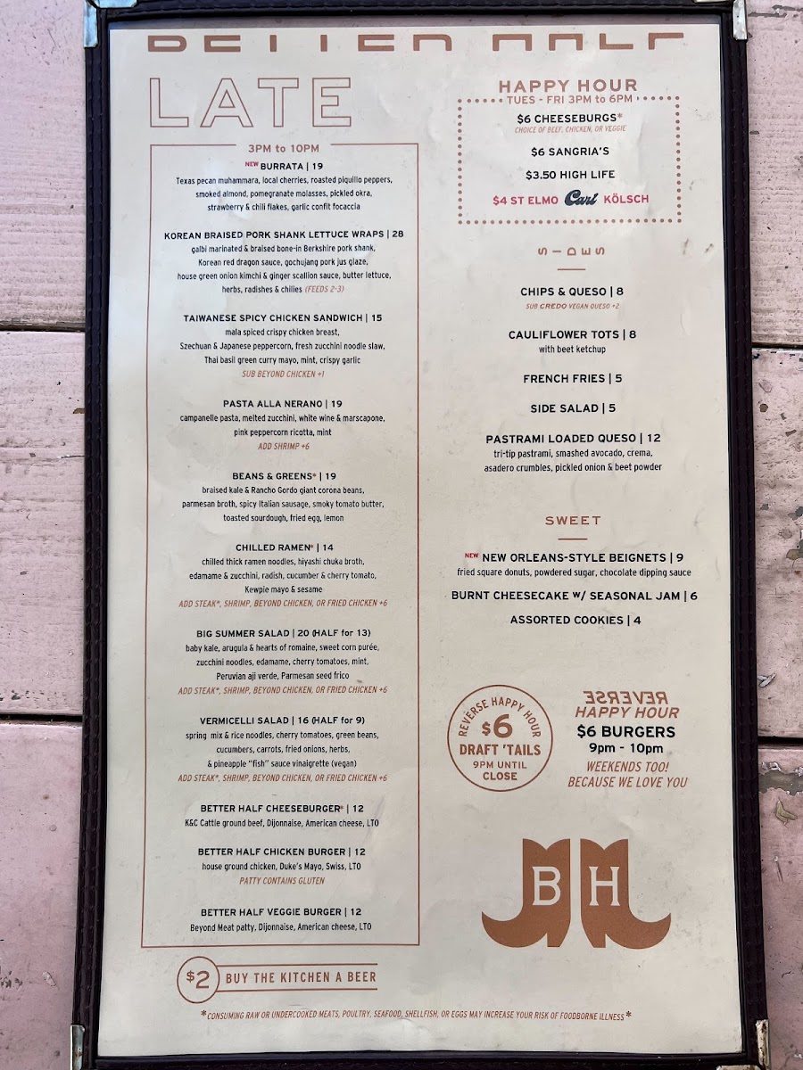 “ Great Vibe and Good Food, Definitely Worth a Visit This is my third time coming to Better Half, and once again, it didn’t disappoint. I ordered the half Chop Chop salad, the single chicken bacon burger, and a veggie burger. It’s hard not to like this place. The amount of property they have means you can almost always find a seat, which is a nice. If you’re into alcohol, I’m sure you’d really enjoy it here as they have a great selection. It’s hard to beat a $7 chicken/beef burger though the patty itself is a bit on the thin side. Everything was solid—the food was good, the service was friendly, and the atmosphere was enjoyable. It definitely feels like a spot that you could always go to and know what you’re getting. ”