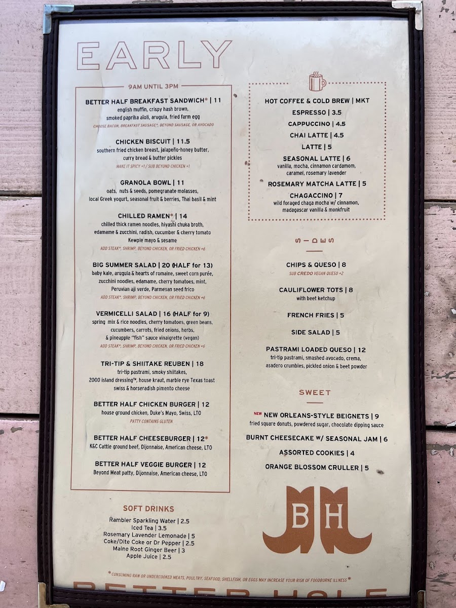 “ Better Half has been on our radar for a long time now, so we popped in for a late weekday breakfast. The property is really nice with a number of inside seating spots as well as plenty of outside seating under some lovely, old oak trees. We ordered the Breakfast Sandwich (with sausage), the Fried Chicken Biscuit (spicy), and the Cauliflower Tots. Even though they were a bit busy, the food came out quickly. Both sandwiches were really delicious. The flavors in the breakfast sandwich all melded together really nicely. The chicken was cooked to perfection and the biscuit was buttery and fluffy. The tots weren't our favorite, but they were nice and crunchy with a sweet beet ketchup. I'd love to come back to try more items from their menu as well as their coffee and cocktails. ”